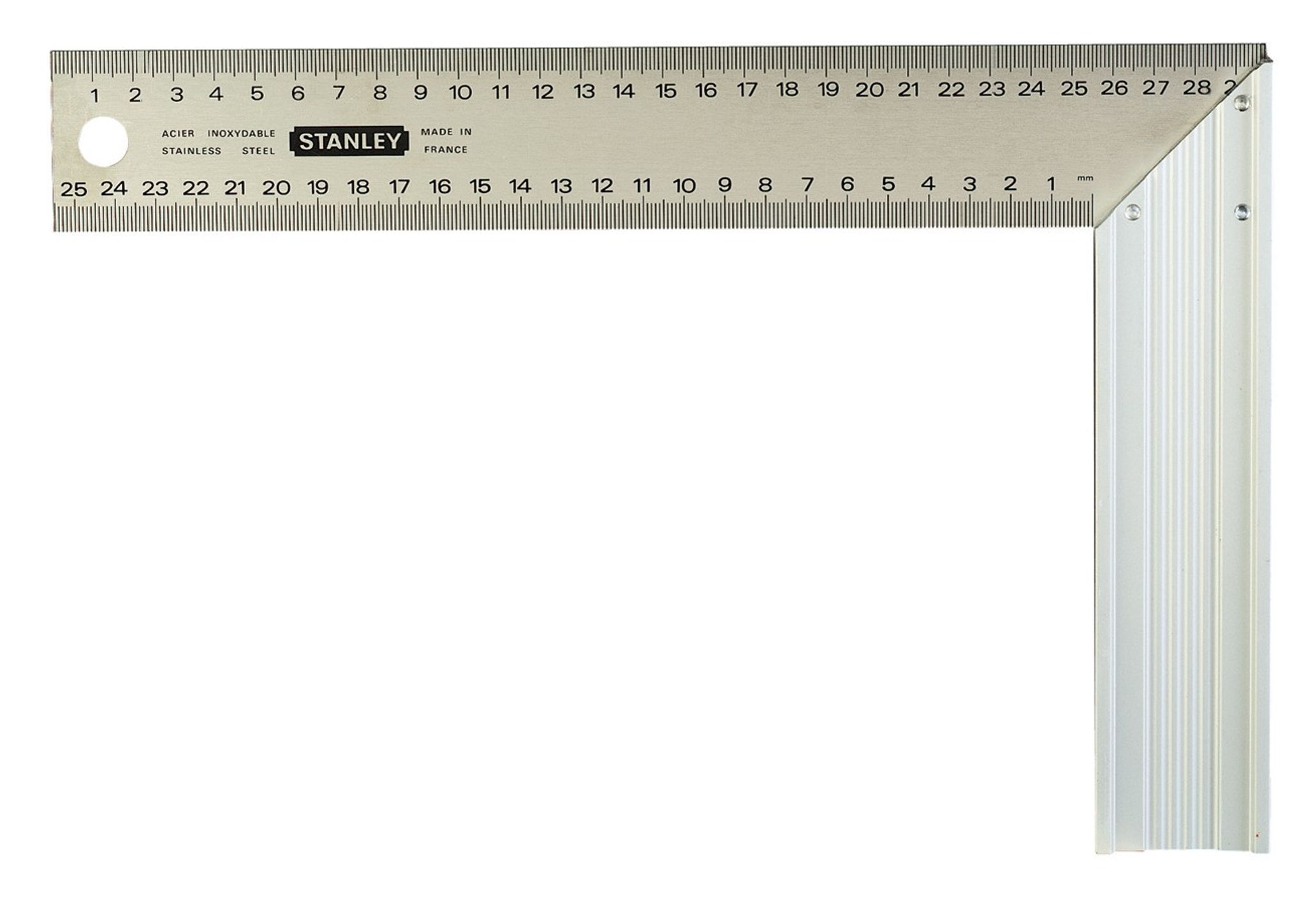 mm-graderingar på båda sidor. Avfasat anslag för märkning av både 90° och 45° vinklar. Extruderat aluminiumanslag som är fäst med tre nitar till bladet ger både styrka och noggrannhet. Lättavläst blad i rostfritt stål med fotoetsad gradering med djup urholkning (GRAVEMAT-procedur). Anslag i aluminiumprofil