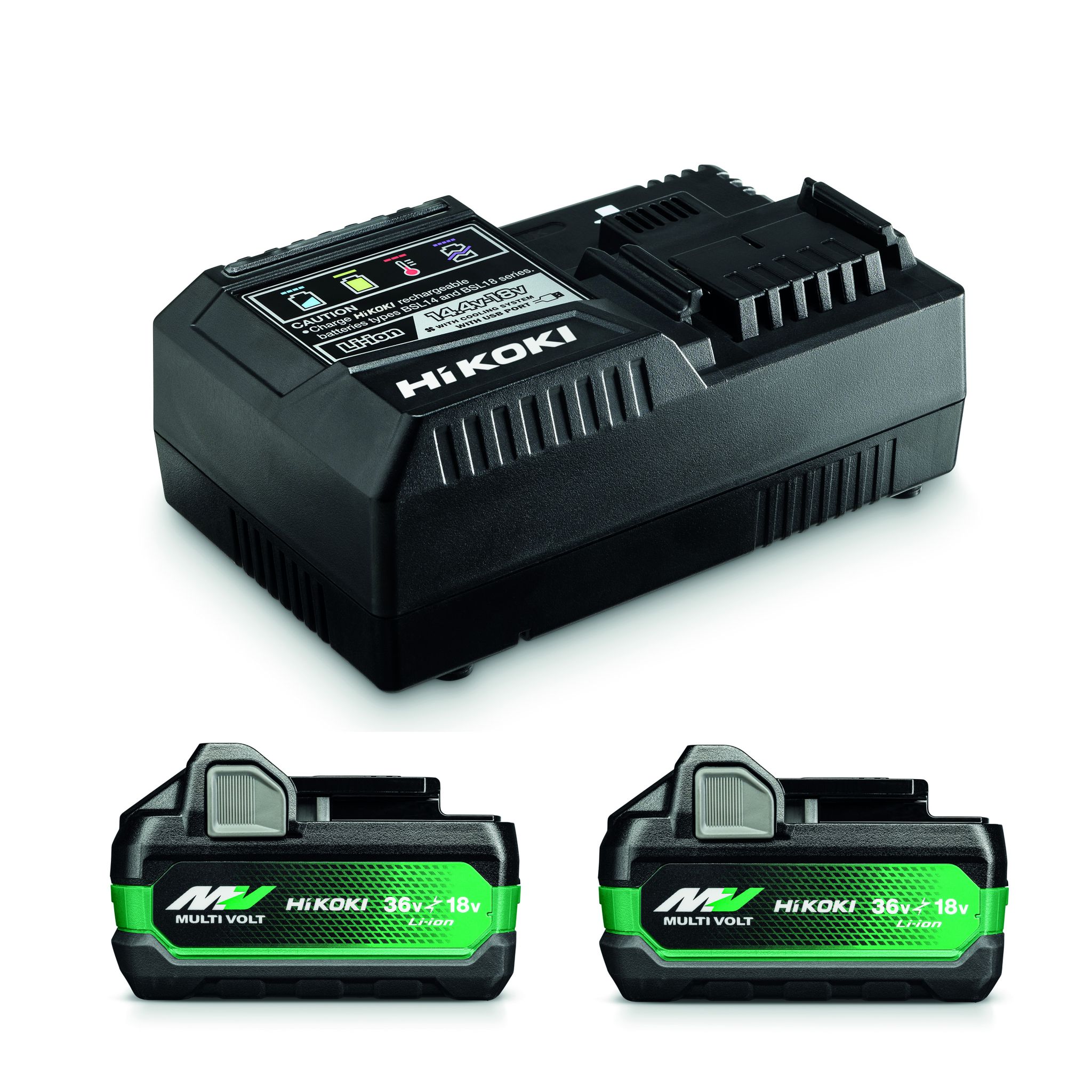 Två stycken smarta batterier som kan användas både i 18V- (5,0Ah) och 36V-verktyg (2,5Ah).
