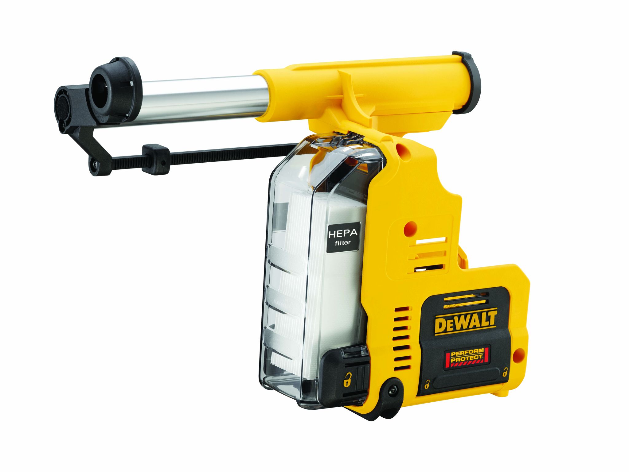 DEWALT D25303DH är ett kraftfullt dammutsugssystem för 18V SDS-plus borrhammare, särskilt anpassat för modellerna DCH273 och DCH274. Med en egen motor som inte påverkar maskinens prestanda och ett tvättbart HEPA-filter som fångar upp till 99,5 % av dammpartiklar ner till 0,3 mikron, får du en ren och säker arbetsmiljö – även vid krävande borrjobb.