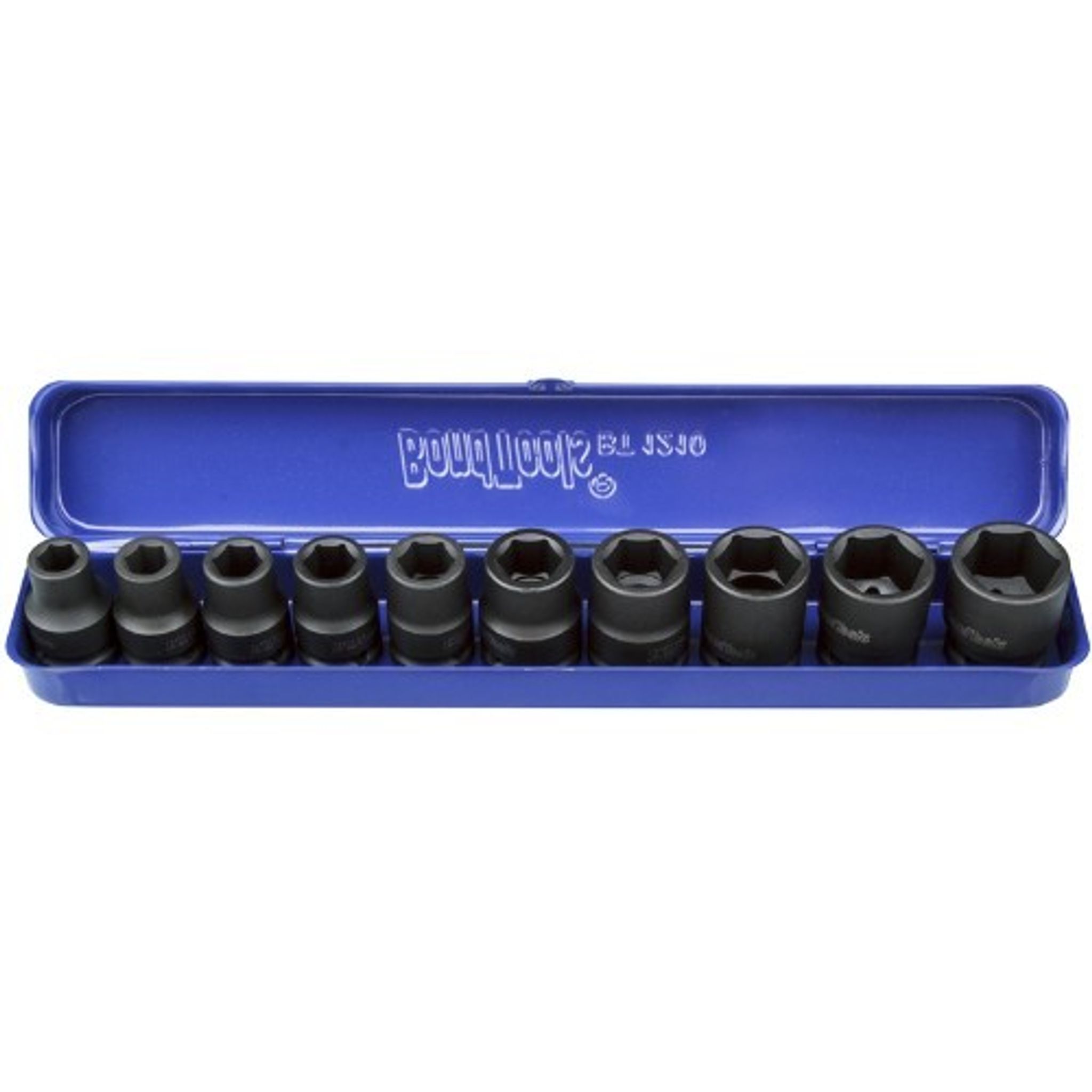 Krafthylssats i 10 delar innehållande krafthylsor med 1/2\" fyrkantsfäste. Längd 39 mm. Industrikvalitet av krom-molybdenstål. Levereras i metallåda (310x50 mm)."