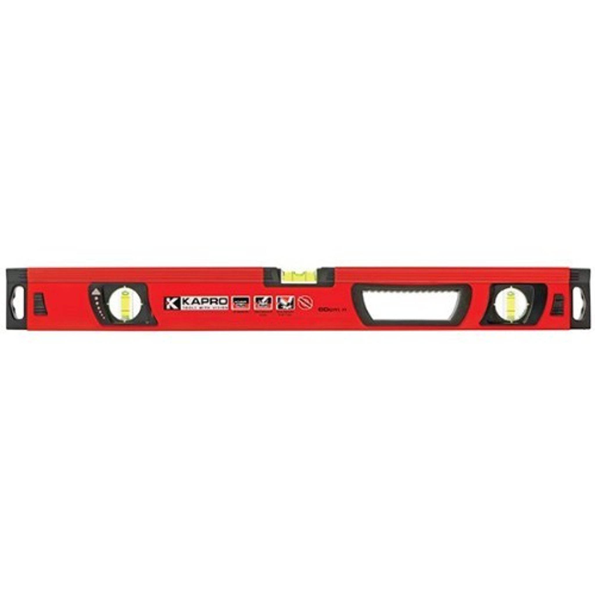 Vattenpass av aluminium, med tre fasta stötsäkra libeller av akryl, två vertikala med Plumb Site-Dual View-libell och en förstorad horisontell libell för en tydligare bubbla. Förstärkt profil för att upprätthålla exaktheten under tuffa arbetsförhållanden. Två finslipade ytor med V-spår för avvägning av rör. Ändskydd av gummi. Ergonomiskt handtag för bekvämt grepp. Tolerans: < 0,5 mm/m